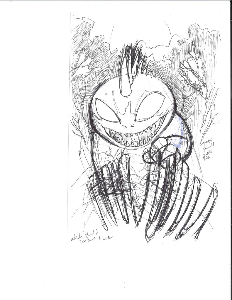 This little guy was initially meant to be a character in a story arc of my BEDLAM comic strip. I may dig those notes up and rewrite it someday. What I wanted was something more cartoony. Not very menacing but hinting at being a potential problem. It helped that one of the main characters is a goat. I have a sheet of rough drafts of this guy. My aim was something Matt Groening-esque. I had his HELL books long before I knew the Simpsons and they were great for warping my pre teen mind. Just when it is needed most.
