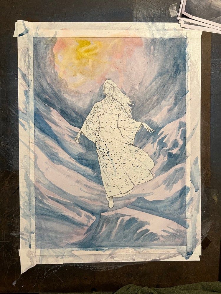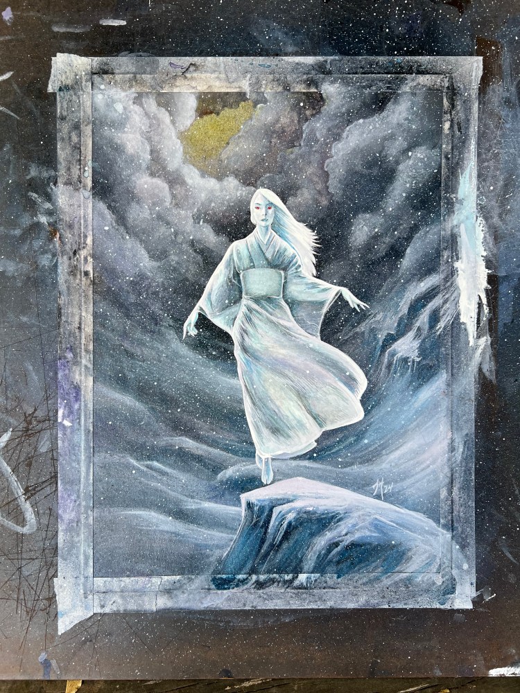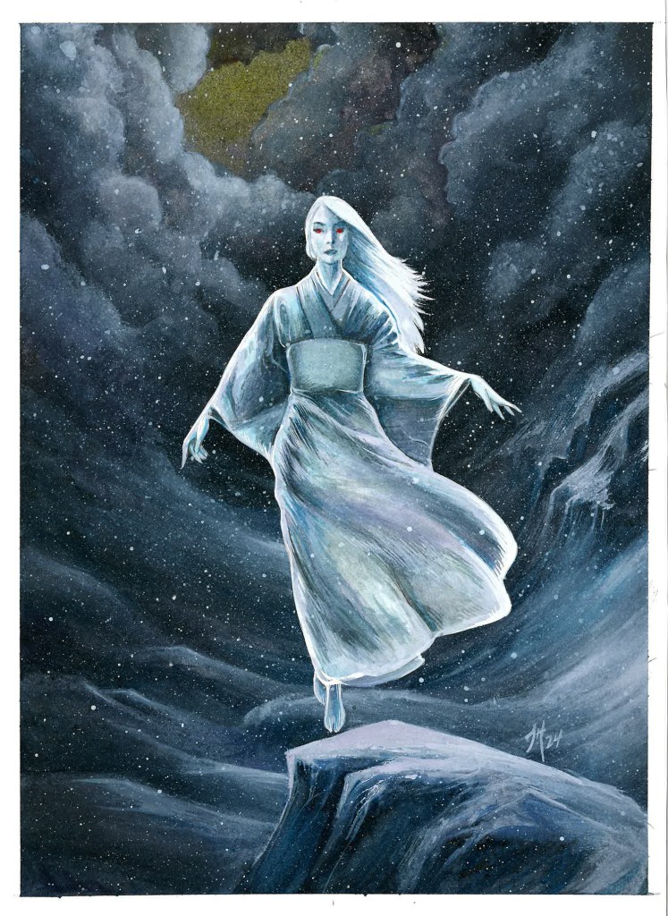 Yuki-onna, or “snow woman” is a spirit (or yokai) in Japanese folklore. Sometimes good, sometimes bad. You got Google if you want to look all that up. I had already read all the stories and just wanted something wintery. Plus I like the art of the kimono and enjoy drawing them.