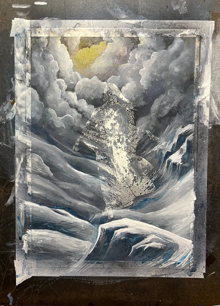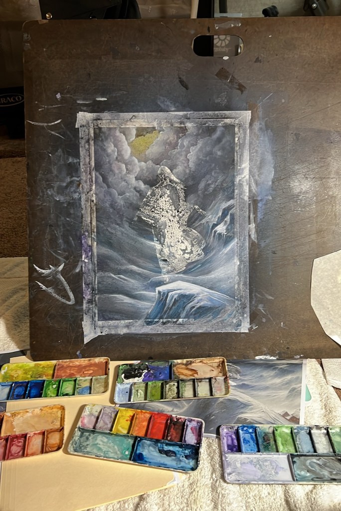 I had other plans. The sun and purples gave off a warmer feel than I wanted for this piece. Plus I wanted a stormier look. So I started fleshing out the hills and clouds with some Paynes Grey and white. Adding in some blues to get a little colder. At this point I was muddying up the colors with some overworking and I felt like I was getting into a more monochromatic look.