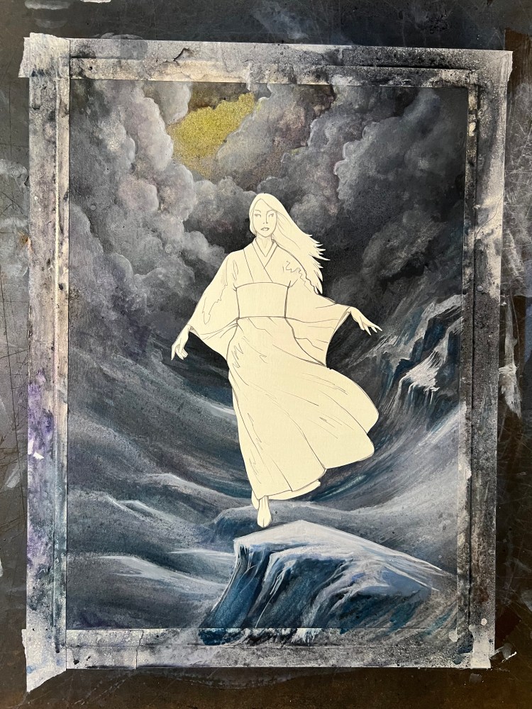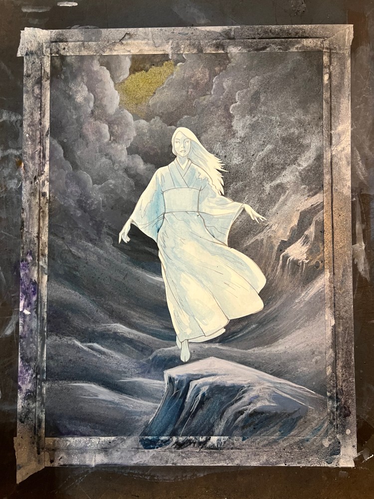 I wanted the figure to be more monochromatic not the background (she is a ghost after all) so I reintroduced some purples and more blue. Correcting the clouds I wasn’t happy with along the way. And hammering those hills and rocks into better positions.