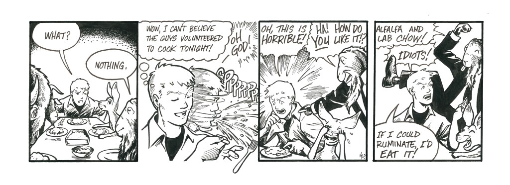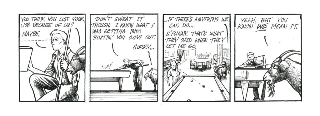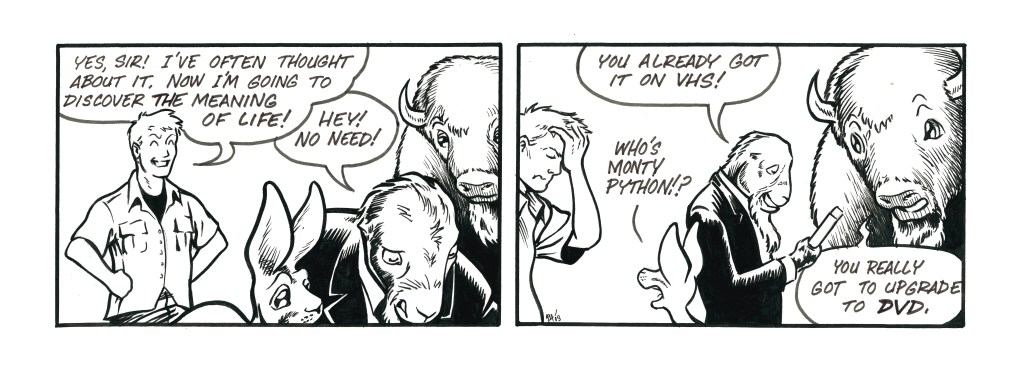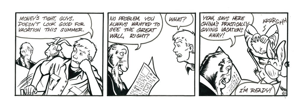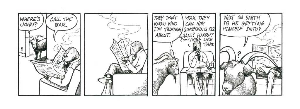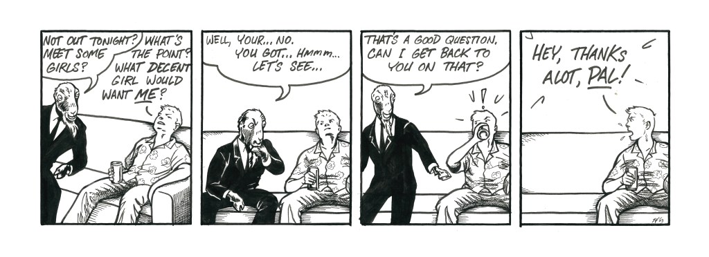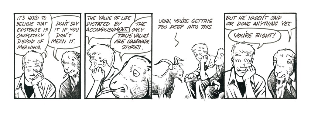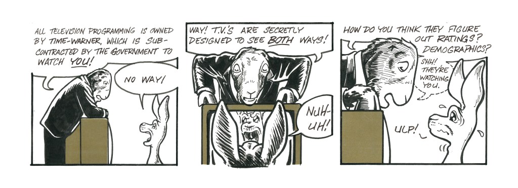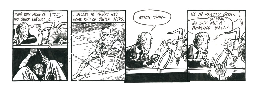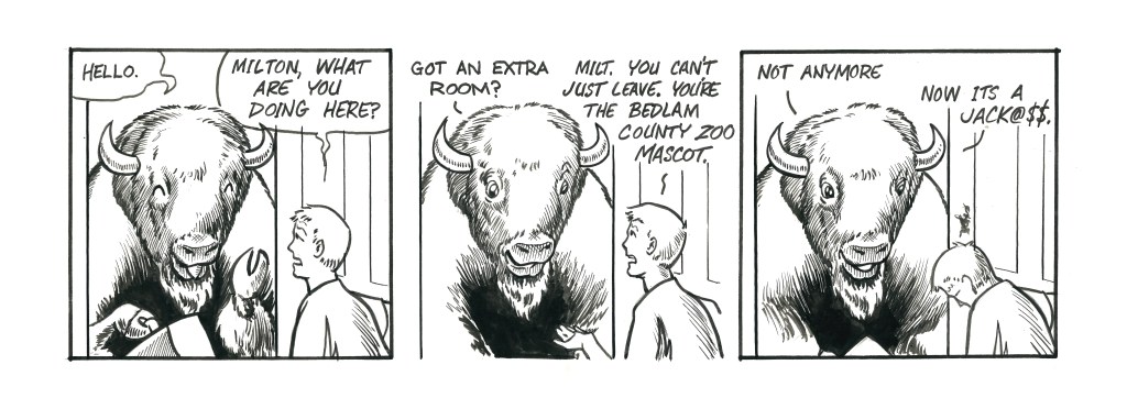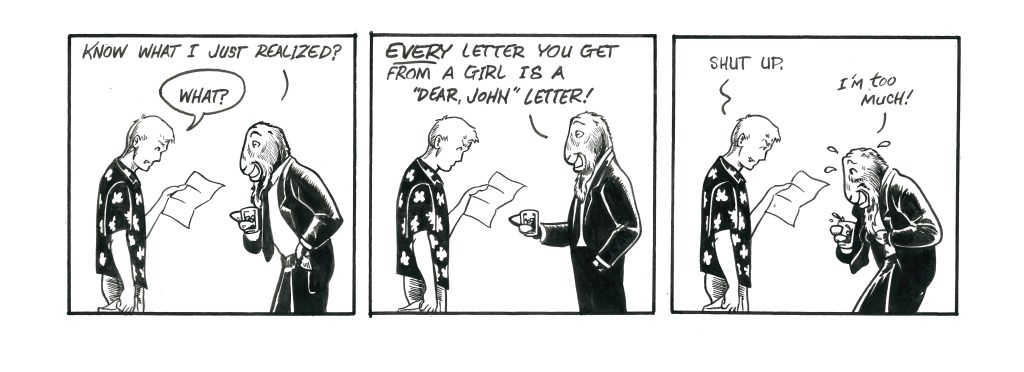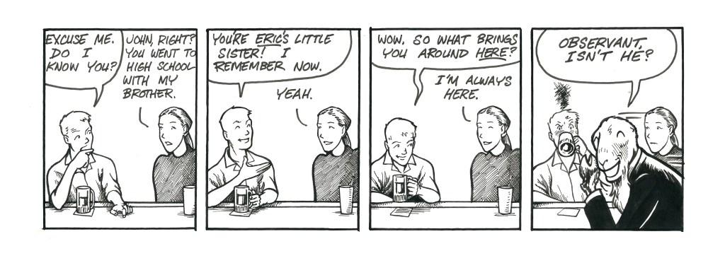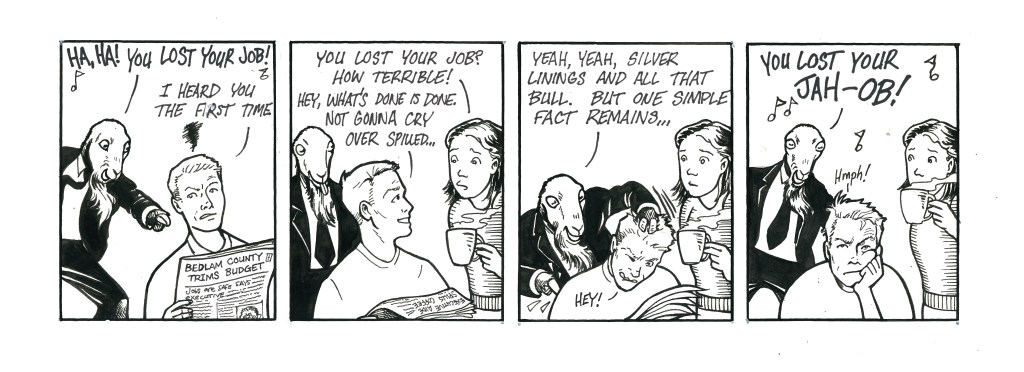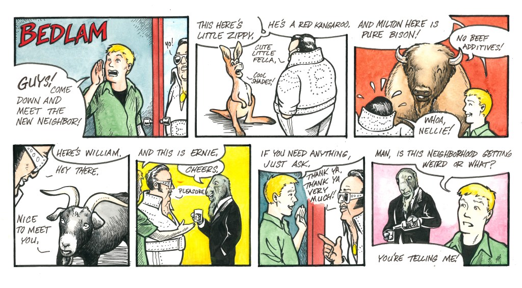 Long time ago in a galaxy right down the street, I was experimenting with the daily comic strip format and developing a strip called BEDLAM. It was a practice in speed (because daily strips are done, well, daily) so the art was not always the best. The goal was to make it as good as possible in the time allotted. I’ll post many of those in this album mainly for posterity (I’m cringing already). But there is a few gems among them. This strip was nowhere near my best work. © John Heatter.