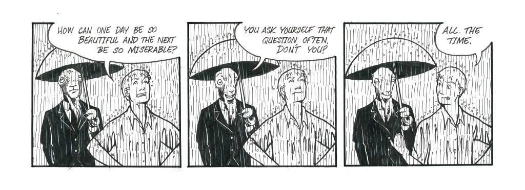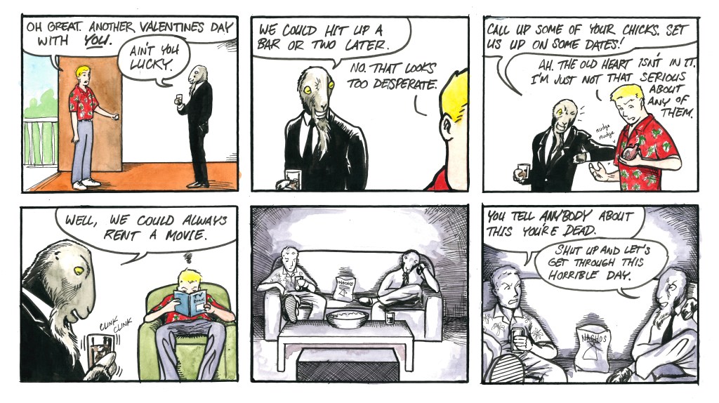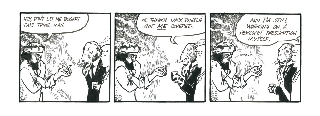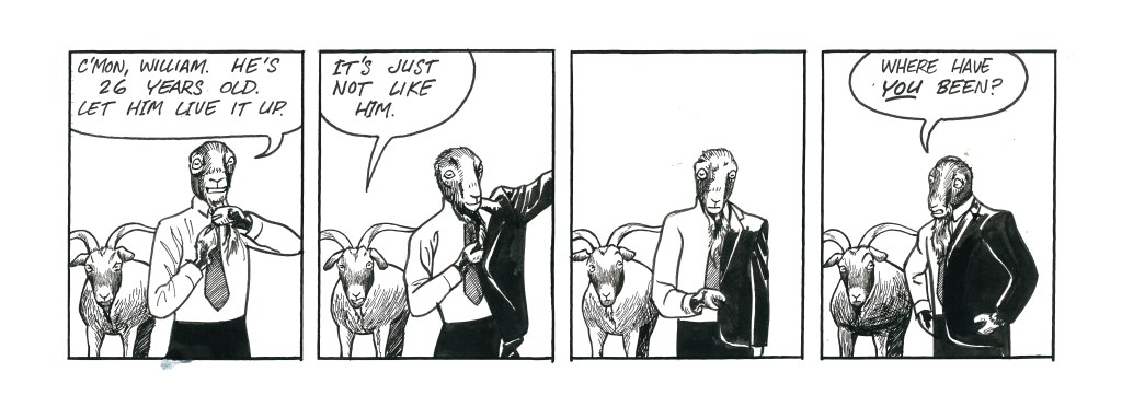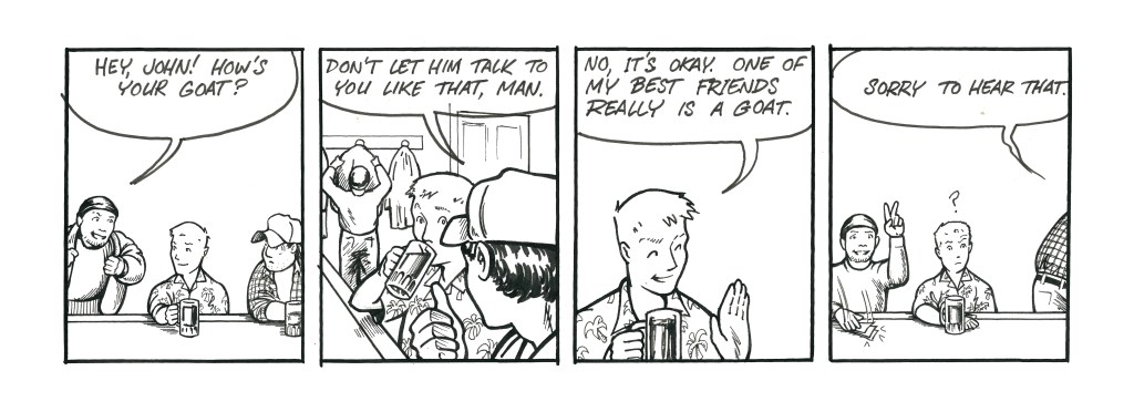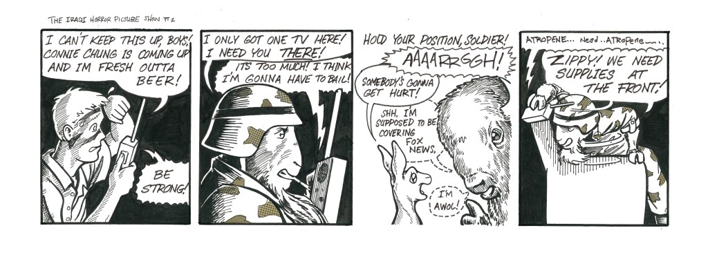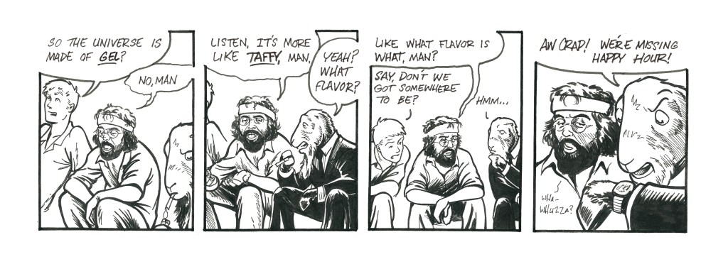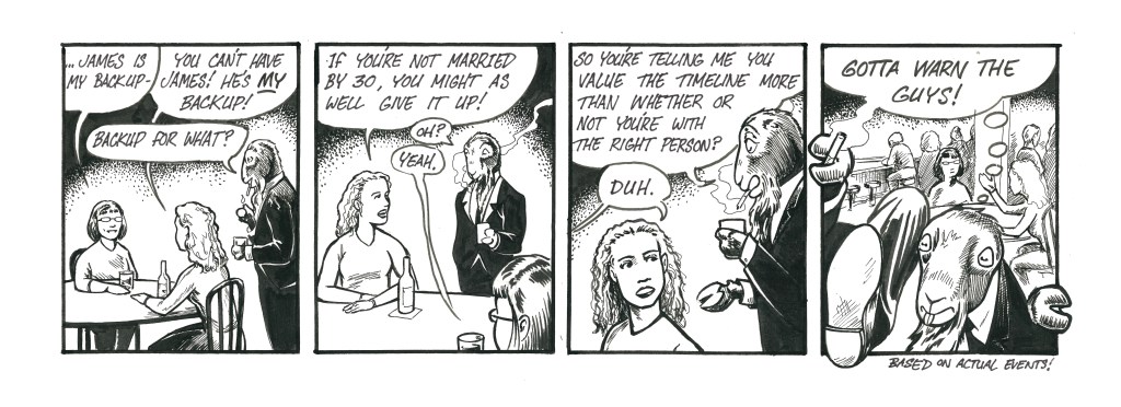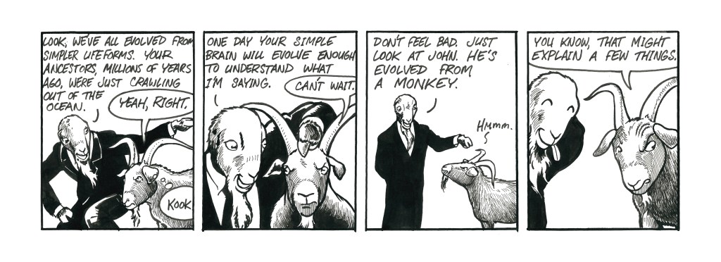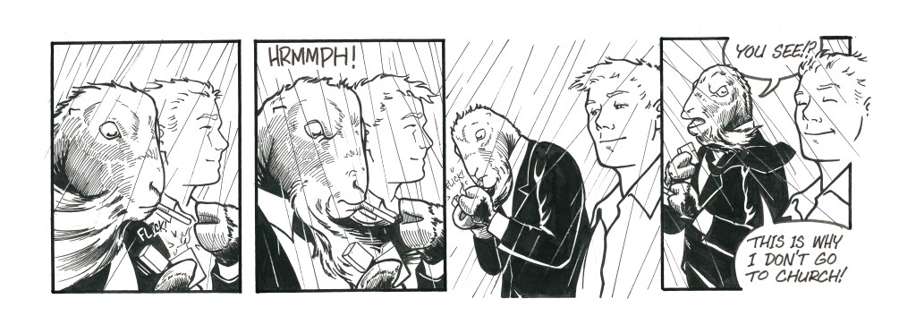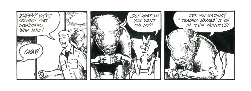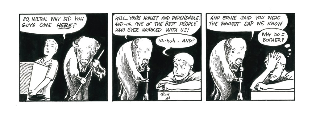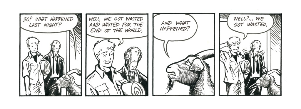 Long time ago in a galaxy right down the street, I was experimenting with the daily comic strip format and developing a strip called BEDLAM. It was a practice in speed (because daily strips are done, well, daily) so the art was not always the best. The goal was to make it as good as possible in the time allotted. I’ll post many of those in this album mainly for posterity (I’m cringing already). But there is a few gems among them. This strip was nowhere near my best work. © John Heatter.