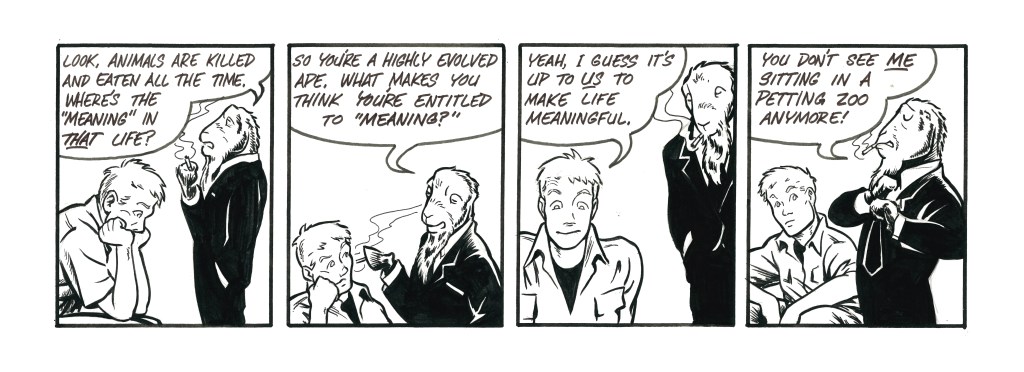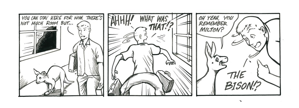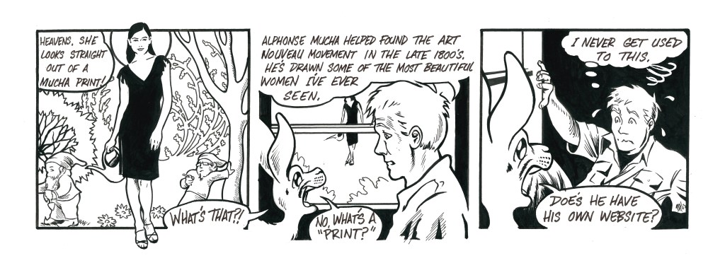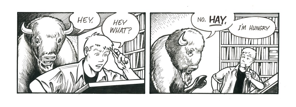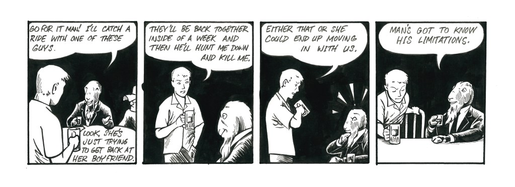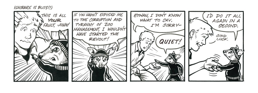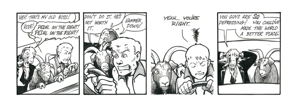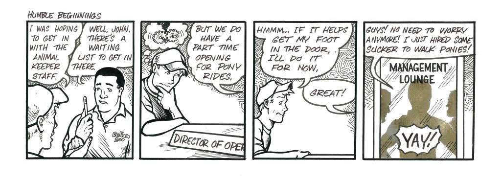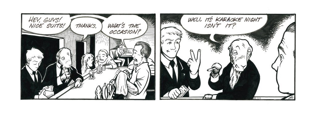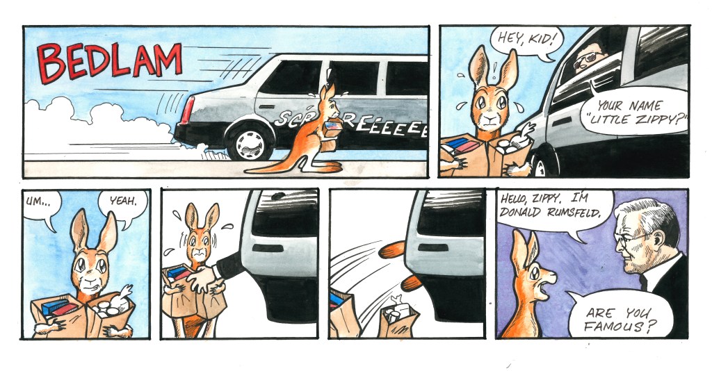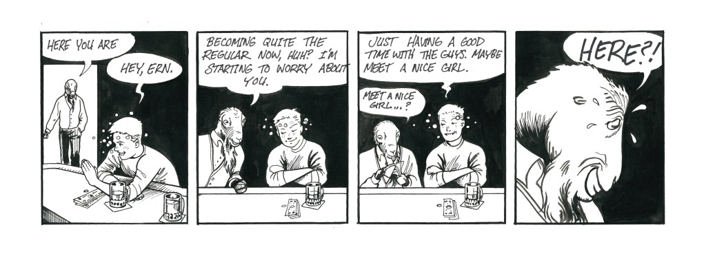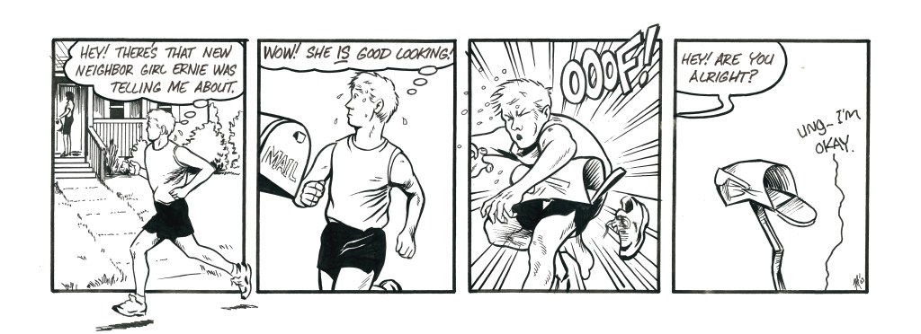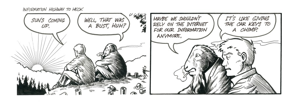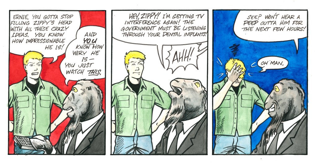 Long time ago in a galaxy right down the street, I was experimenting with the daily comic strip format and developing a strip called BEDLAM. It was a practice in speed (because daily strips are done, well, daily) so the art was not always the best. The goal was to make it as good as possible in the time allotted. I’ll post many of those in this album mainly for posterity (I’m cringing already). But there is a few gems among them. This strip was nowhere near my best work. © John Heatter.